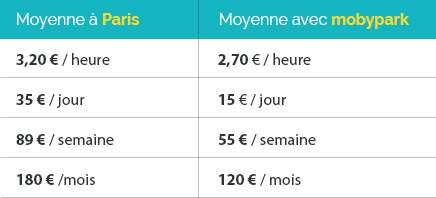Voici un tableau comparatif des prix du stationnement parisien VS les prix de stationnement avec mobypark. Autant dire que la difference de prix ne fait aucun doute