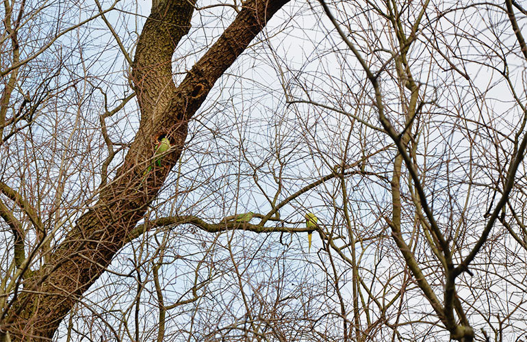 Er zijn een paar kleine vijvers met een verrassende variëteit aan vogels langs de wallekant of in de takken er boven. Als je geluk hebt, kun je een paar heldergroen-roze geringde parkieten spotten, een exotische soort waarvan de populatie het op mysterieuze wijze goed doet in de Amsterdamse parken en tuinen. Je kunt meer lezen over deze parkieten in dit artikel in Culture trip.